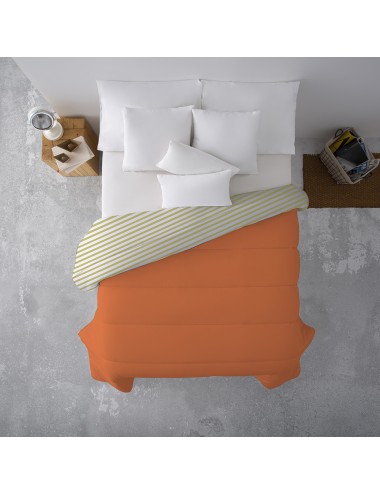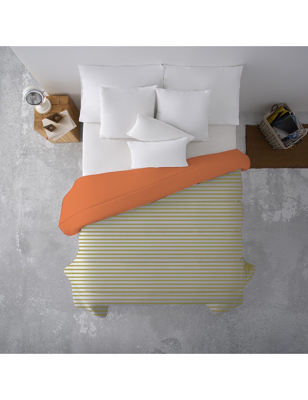 Edredón nórdico REVERSIBLE naranja liso por un lado y rayas pistacho por el otro de 300gr. de fibra hueca siliconada ultraligera y tacto pluma. Nivel térmico medio-alto. Las propiedades más destacadas de esta prenda son: su poder Anti-bacterias, Anti-ácaros, Anti-humedades y Transpirable.